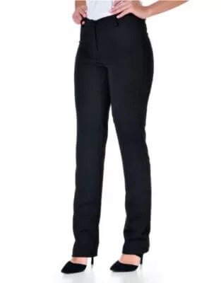 Calça social feminina, em tecido twoway (96% Poliester/4% Elastano), dois bolsos faca na frente e dois falsos atrás, barra reta, cós com passantes para cinto.