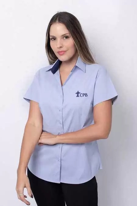 Camisa Feminina, manga curta, em tecido cor azul claro, sem bolso, com interno da gola em azul marinho, aplicação de bordado na frente esquerda.