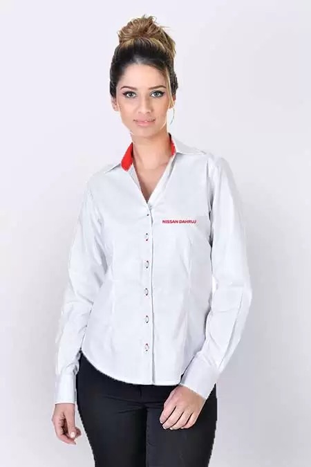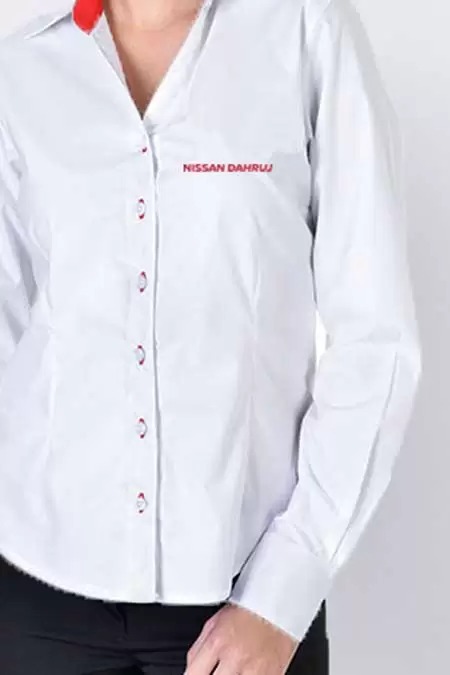 Camisa feminina, manga longa, em tecido liso na cor branca, com caseado dos botões e pé de gola na cor vermelha, sem bolso, aplicação de bordado na frente esquerda.