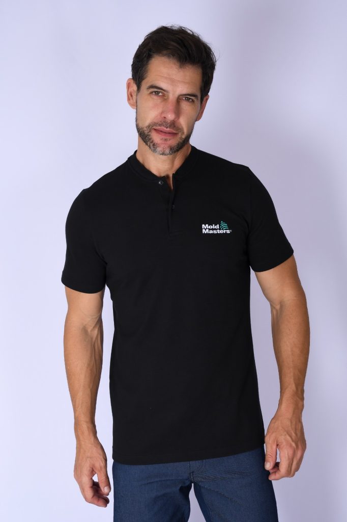 Polo masculina na cor preta com gola padre, ideal para quem busca um visual moderno e diferenciado no ambiente corporativo.