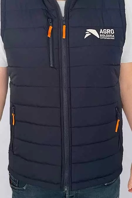 Colete modelo matelassê, em nylon, zipers laterais, frontal e na frente direita com puxadores laranja.
