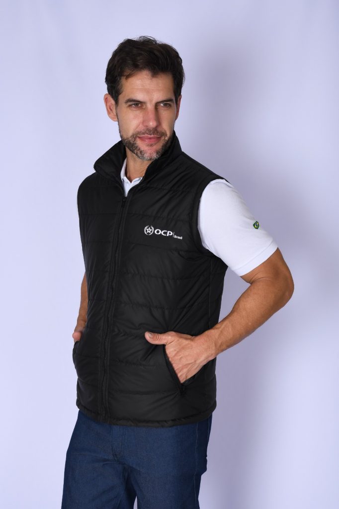 Personalização bordada no peito, unindo conforto térmico e identidade visual com alto padrão.