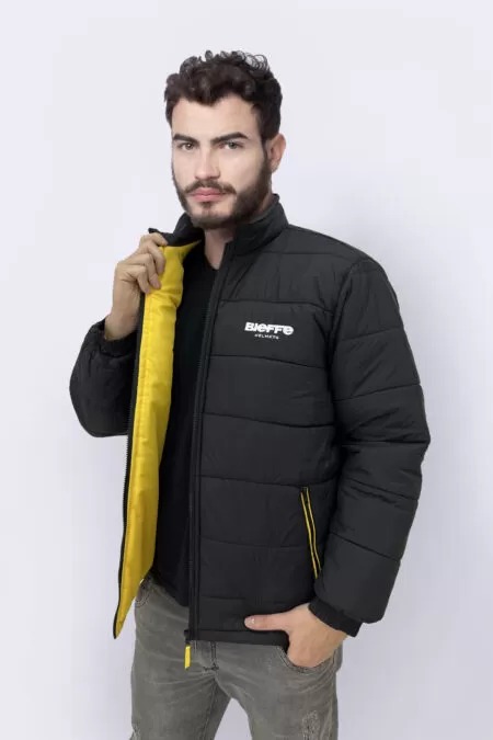 Jaqueta modelo matelassê, em nylon, zíper trator até a gola, bolsos laterais com detalhe de friso na cor amarelo, com interno e puxadores na cor amarelo, aplicação de logo em bordado.