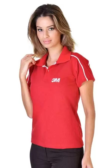 Polo Feminina, em malha piquet, cor vermelho, friso nos ombros e mangas, frente dos botões na cor branco, com aplicação de bordado.